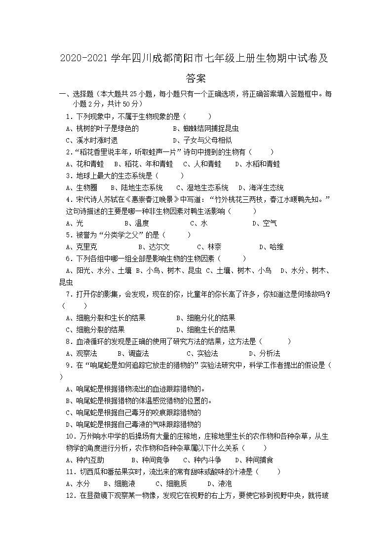 【文档名称】 2020-2021开云kaiyun(中国)年四川成都简阳市七年级上册生物期中试卷及答案(Word版).doc