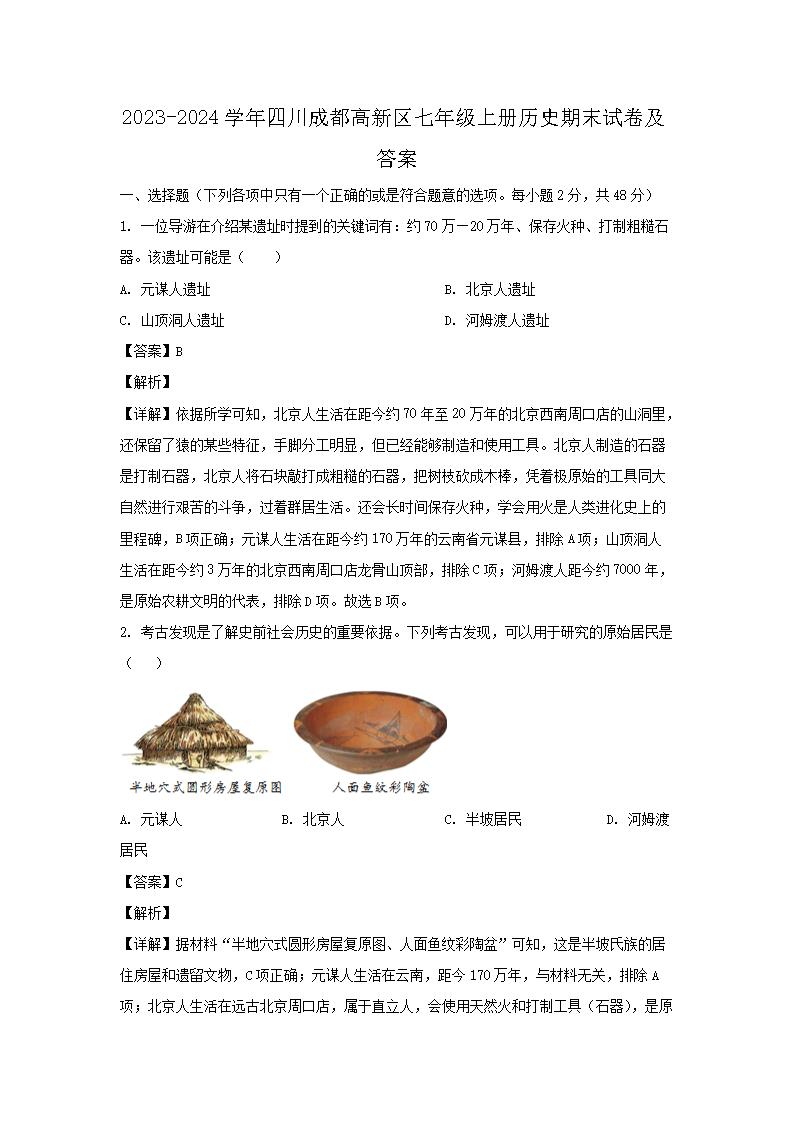 【文档名称】 2023-2024开云kaiyun(中国)年四川成都高新区七年级上册历史期末试卷及答案(Word版).doc