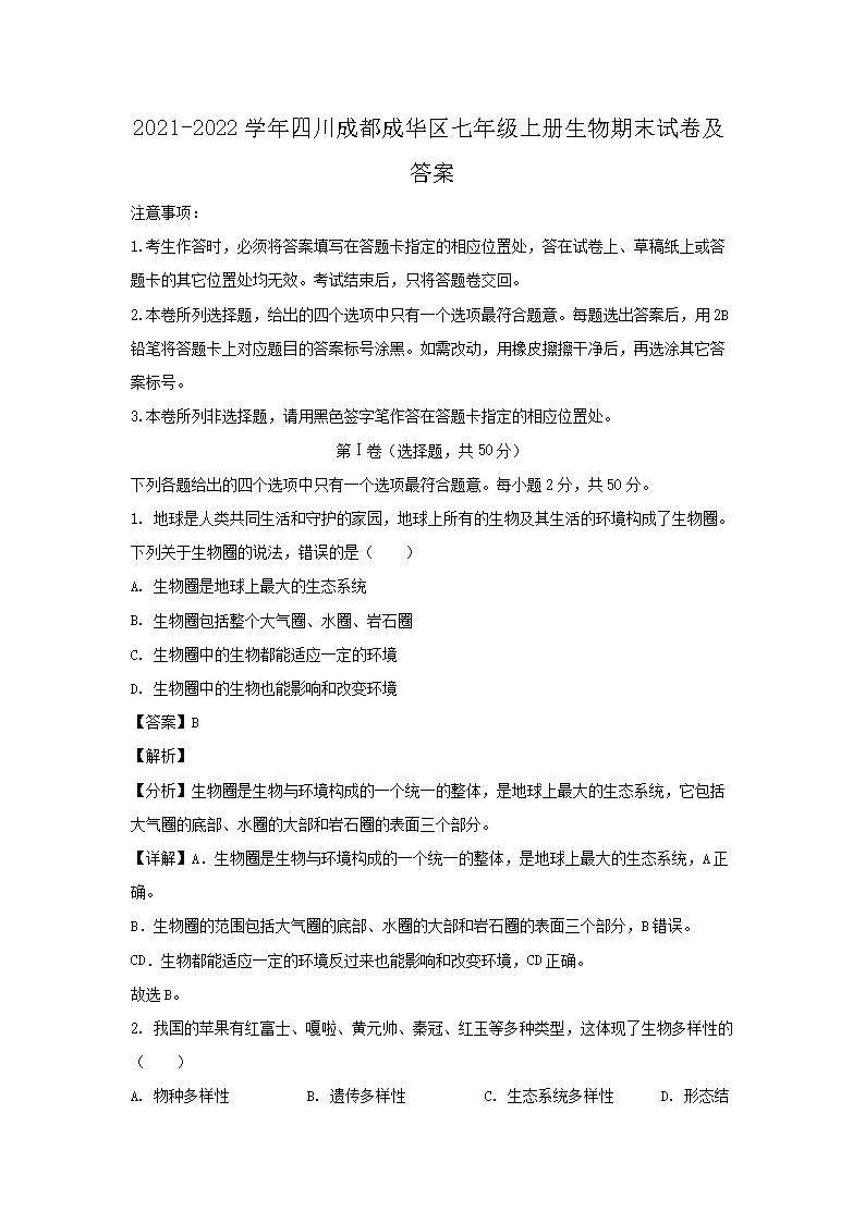 【文档名称】 2021-2022开云kaiyun(中国)年四川成都成华区七年级上册生物期末试卷及答案(Word版).doc