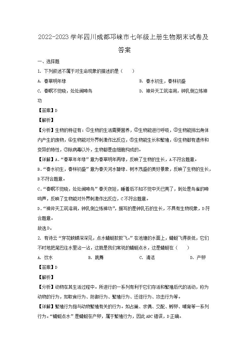 【文档名称】 2022-2023开云kaiyun(中国)年四川成都邛崃市七年级上册生物期末试卷及答案(Word版).doc