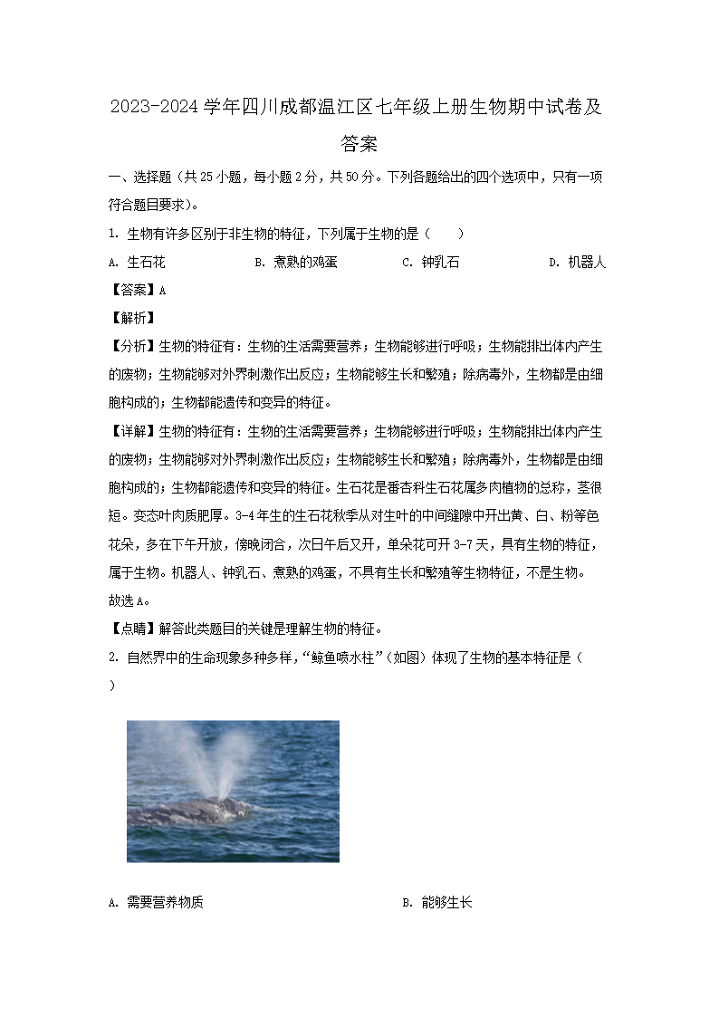 【文档名称】 2023-2024开云kaiyun(中国)年四川成都温江区七年级上册生物期中试卷及答案(Word版).doc