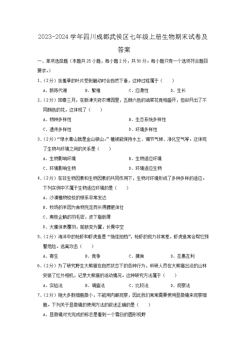【文档名称】 2023-2024开云kaiyun(中国)年四川成都武侯区七年级上册生物期末试卷及答案(Word版).doc