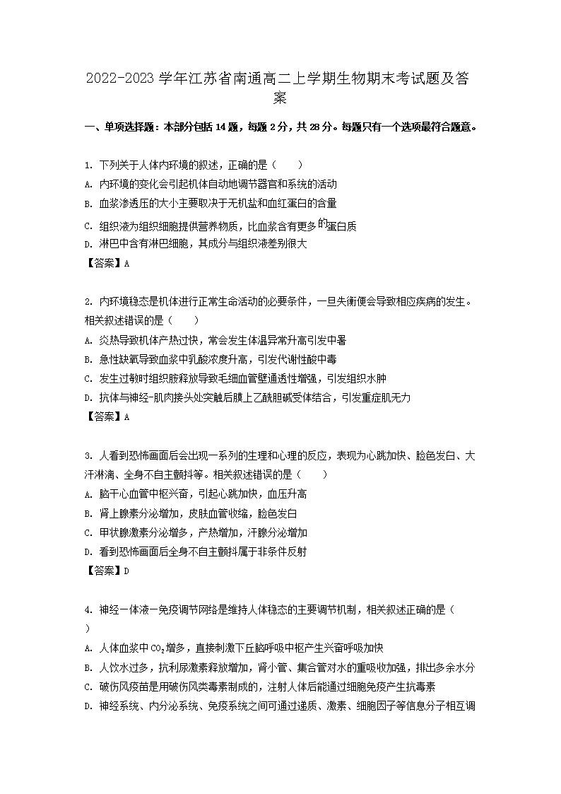 2022-2023开云kaiyun(中国)年江苏省南通高二上开云kaiyun(中国)期生物期末考试题及答案(Word版)