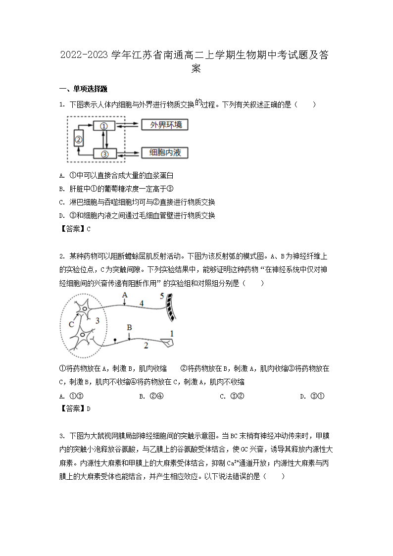 2022-2023开云kaiyun(中国)年江苏省南通高二上开云kaiyun(中国)期生物期中考试题及答案(Word版)