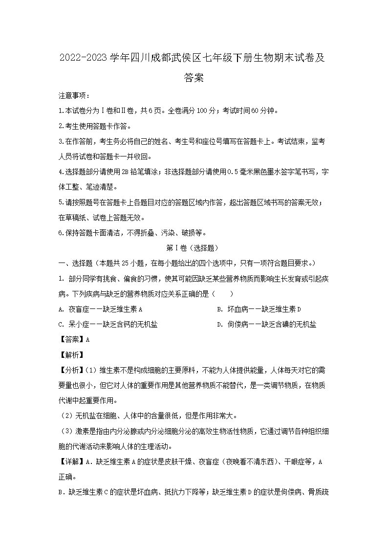 【文档名称】 2022-2023开云kaiyun(中国)年四川成都武侯区七年级下册生物期末试卷及答案(Word版).doc