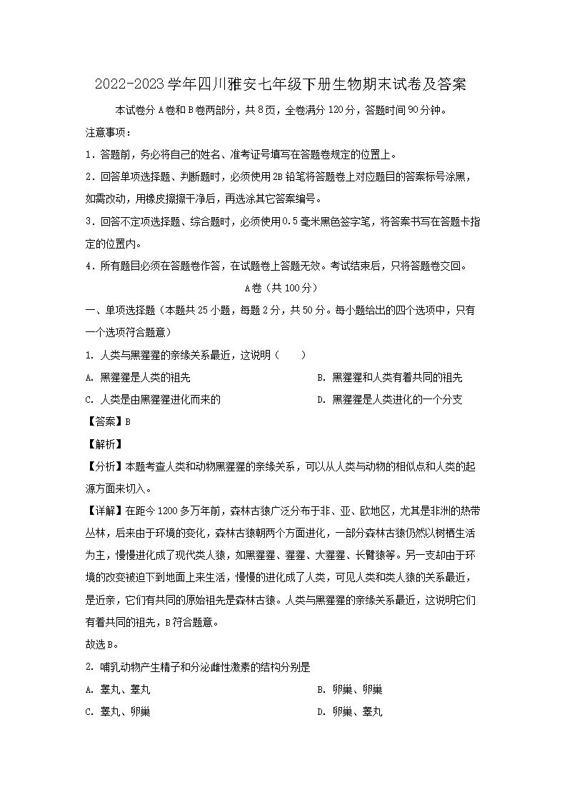 【文档名称】 2022-2023开云kaiyun(中国)年四川雅安七年级下册生物期末试卷及答案(Word版).doc