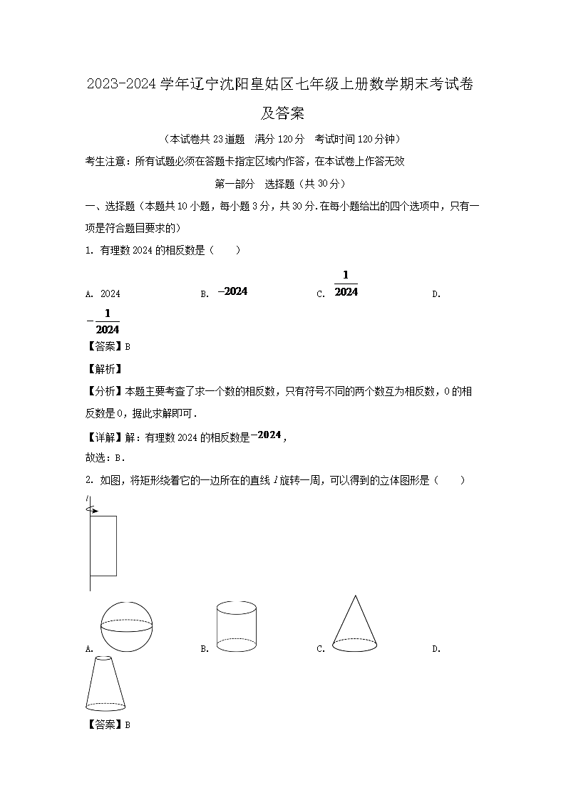 - 2023-2024开云kaiyun(中国)年辽宁沈阳和平区七年级上册数开云kaiyun(中国)期末试卷及答案