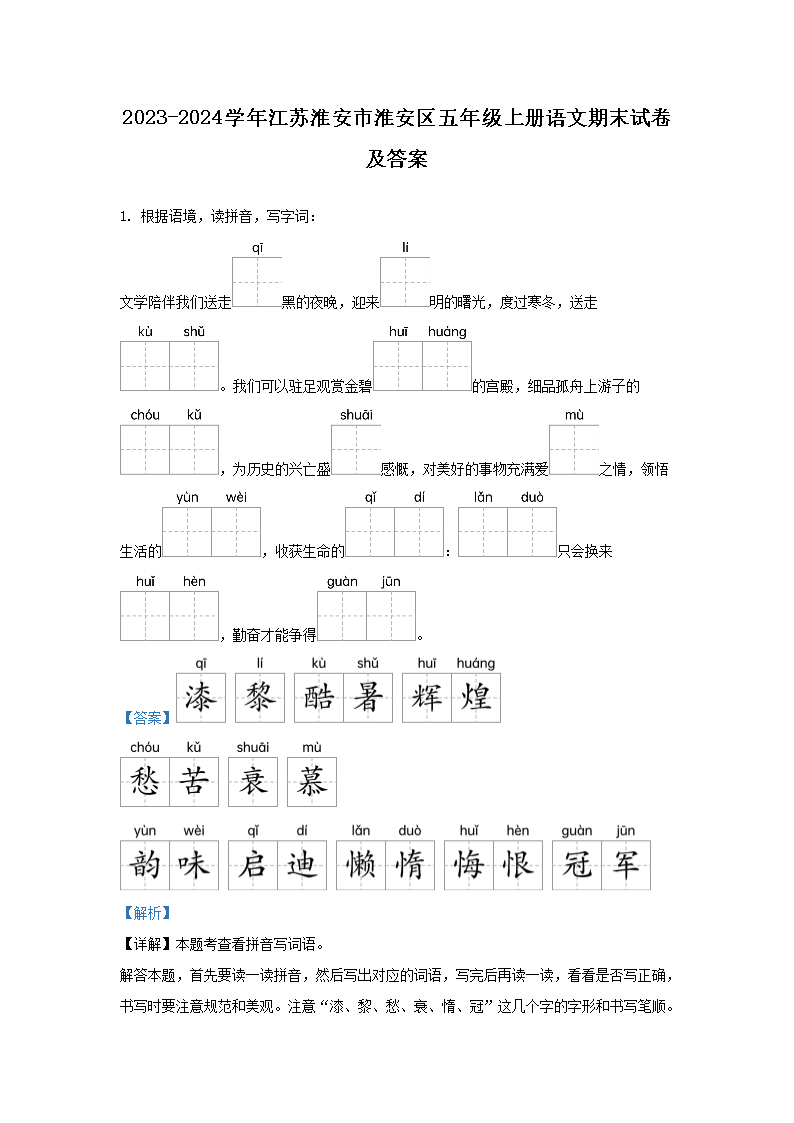 【文档名称】 2023-2024开云kaiyun(中国)年江苏淮安市淮安区五年级上册语文期末试卷及答案(Word版).doc